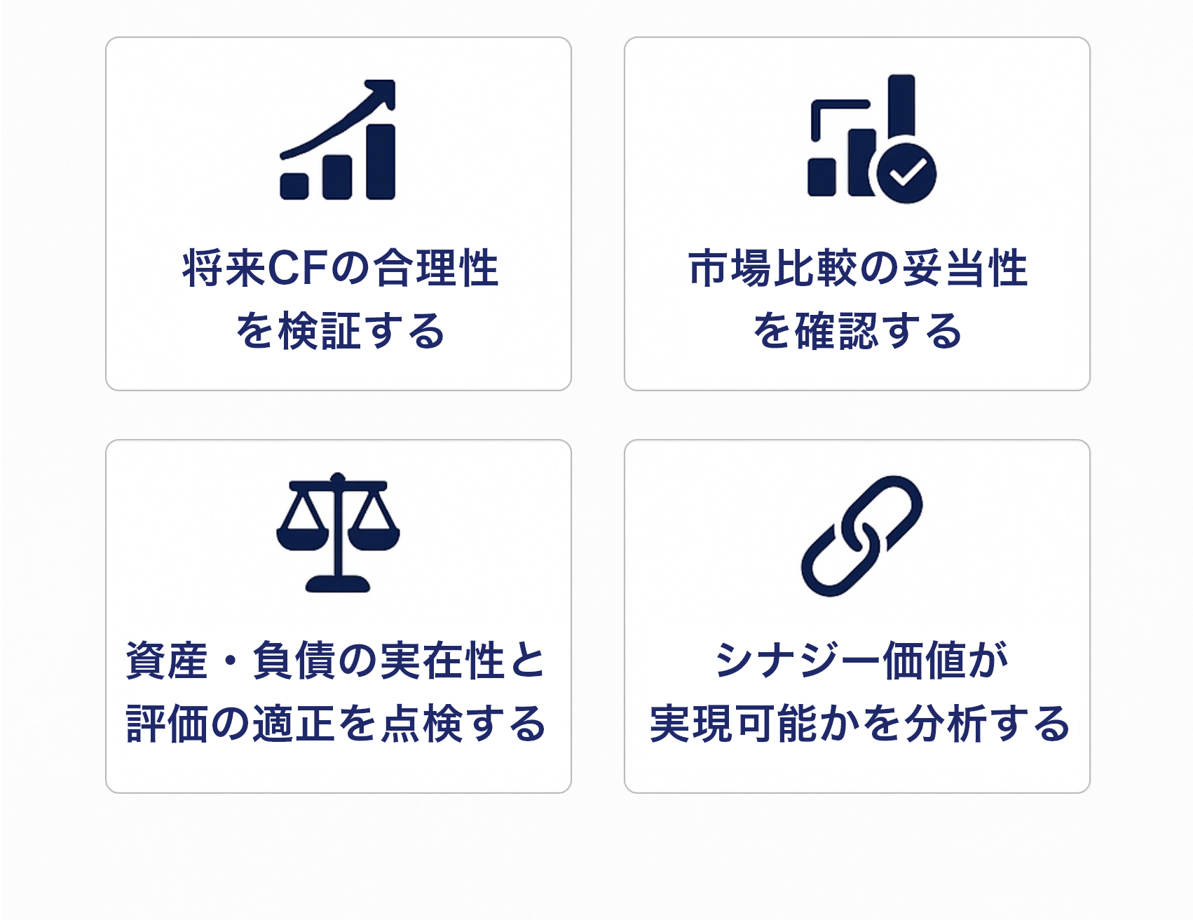 DCF法・マルチプル法・純資産法など複数の評価手法を適切に組み合わせることで、価格の妥当性・交渉の根拠・投資判断の裏付けを明確にします。
